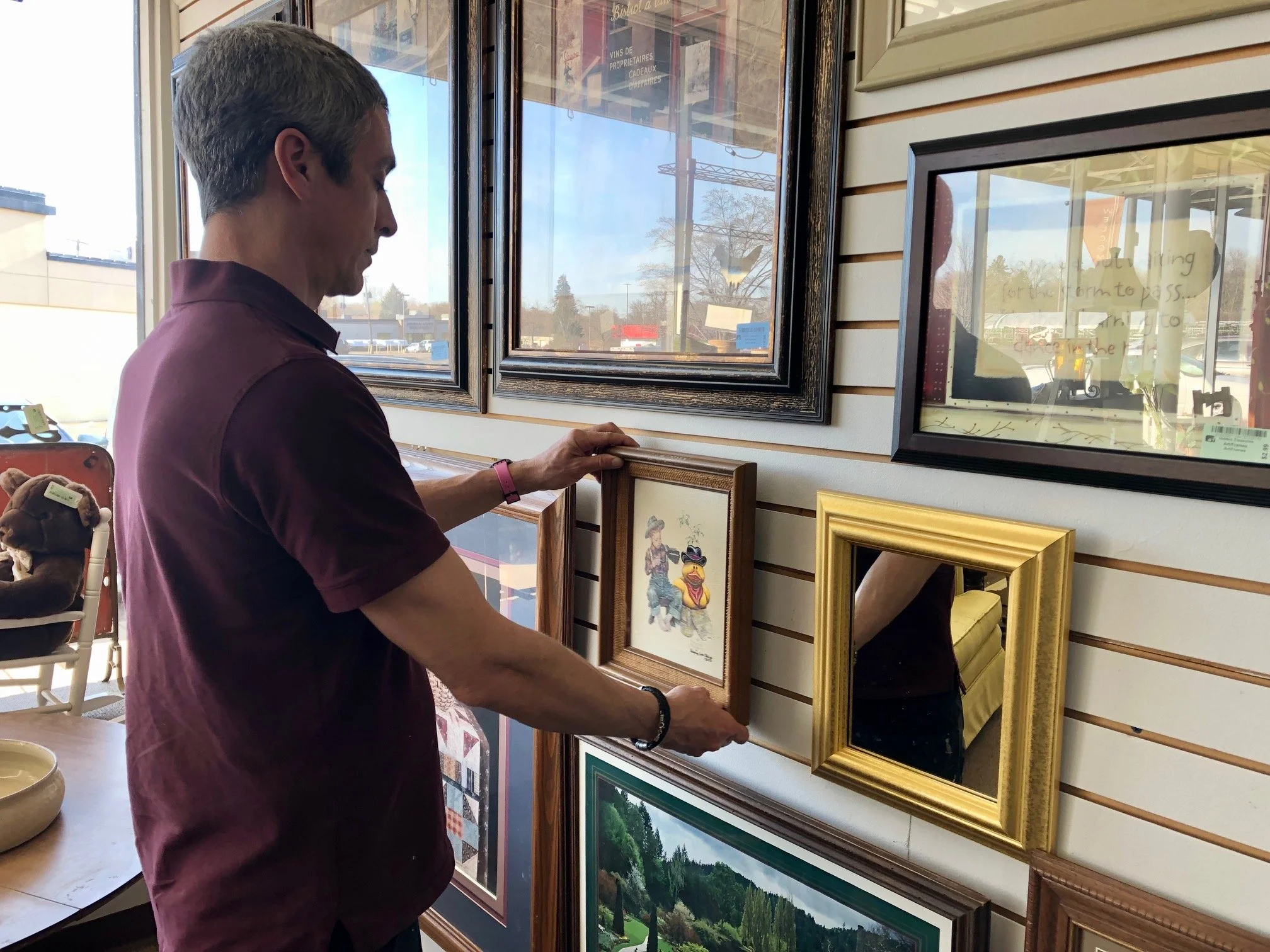 Hanging the "new" collaborative painting back on the wall at the thrift store.