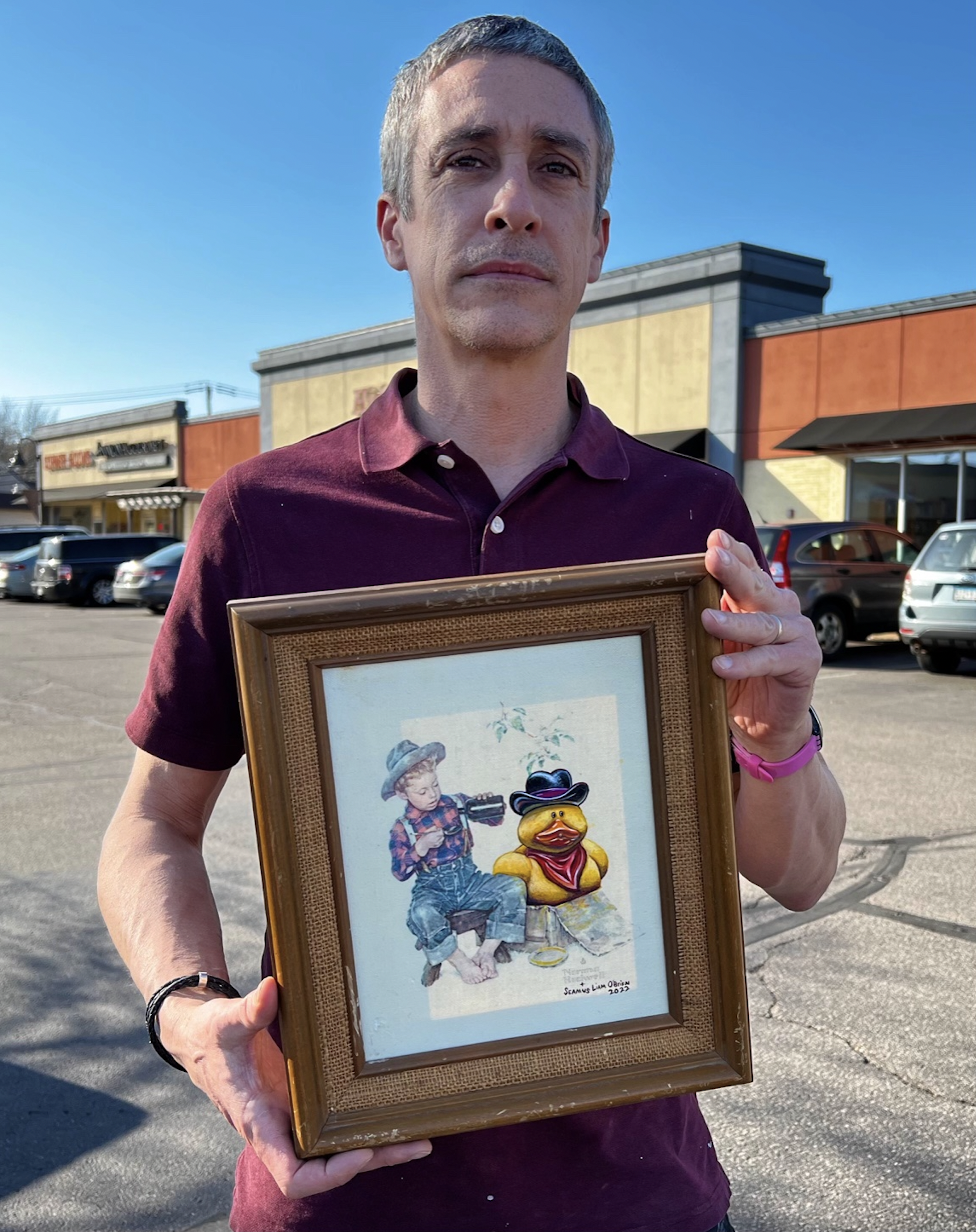 Seamus Liam O’Brien about to deliver the finished painting to Hidden Treasures Thrift Store in Minneapolis.