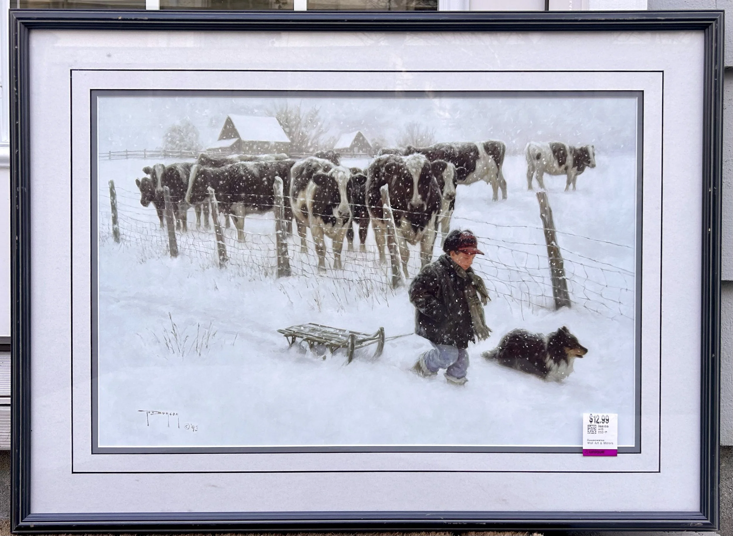 The print, ‘Curious Onlookers,’ shows cows watching a boy as he walks by with his dog in the snow.