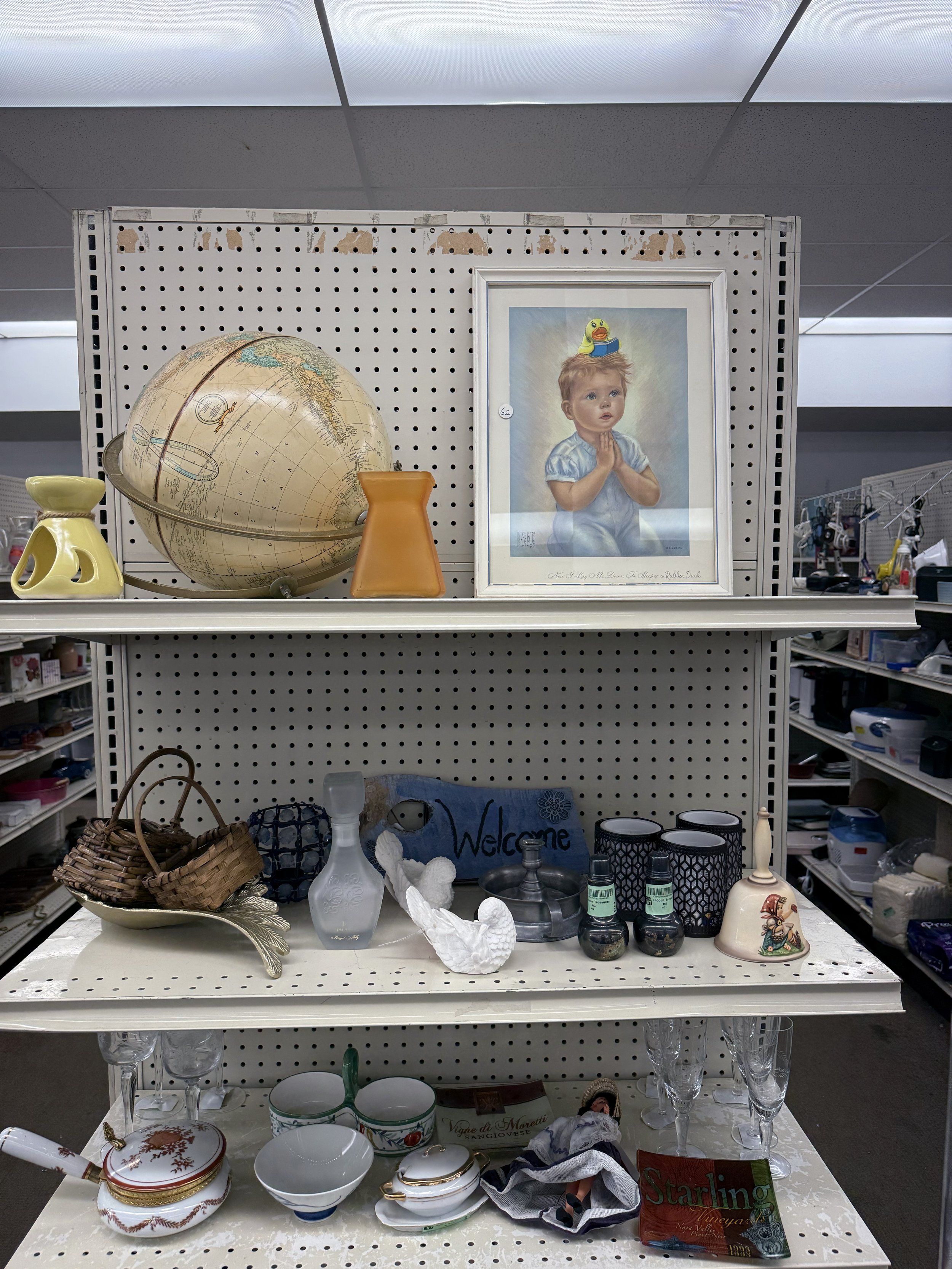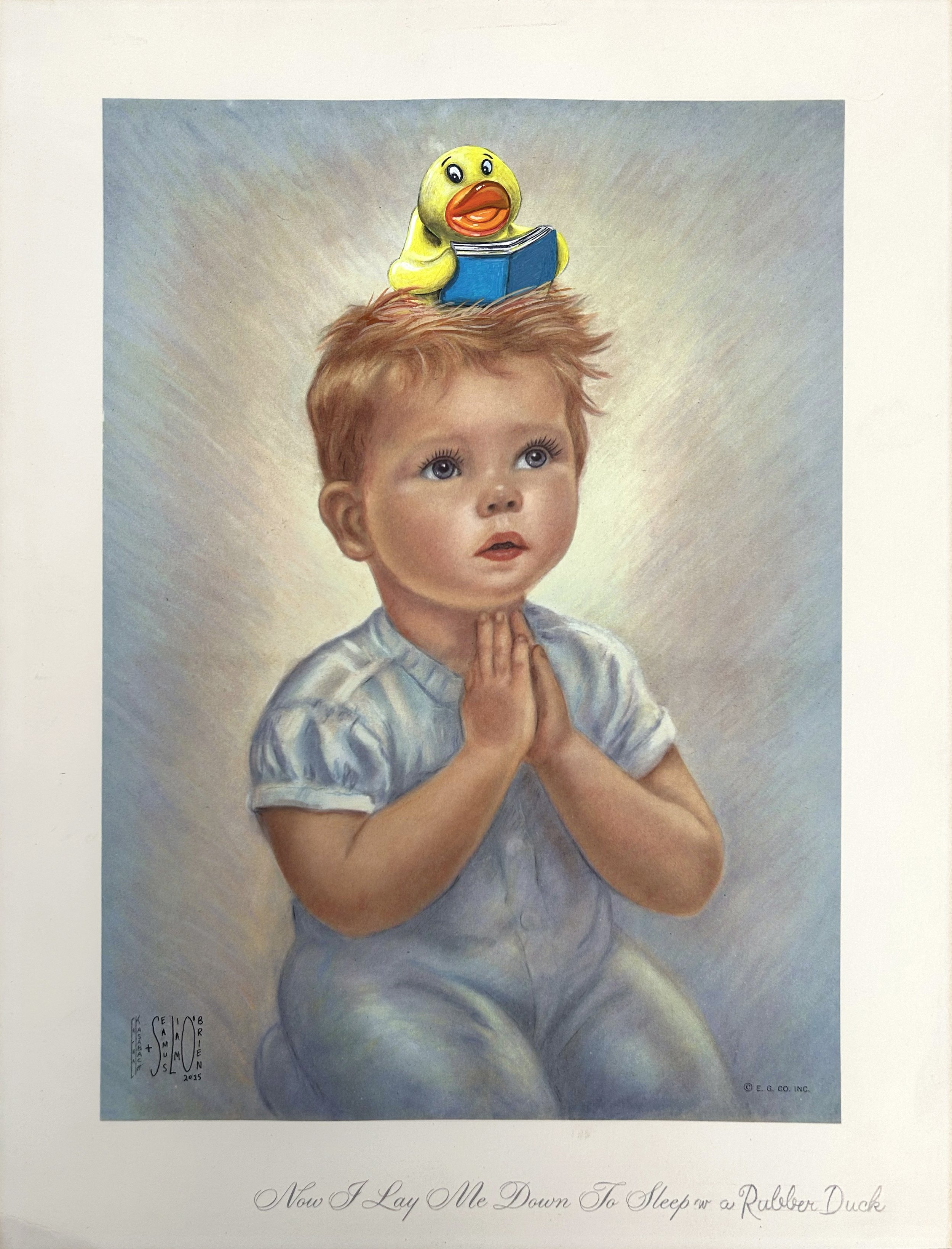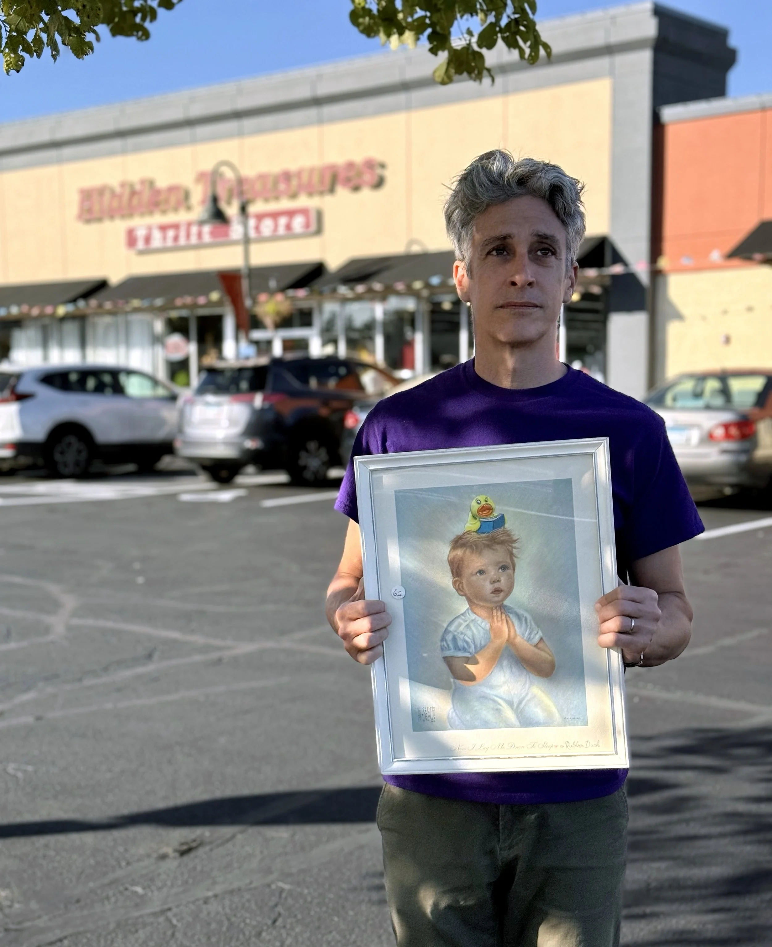 I painted a yellow rubber duck reading a book (or maybe singing a hymn?) on the child’s head and returned this “new” artwork back to the same thrift store on 09/27/2025, around 5:03pm.