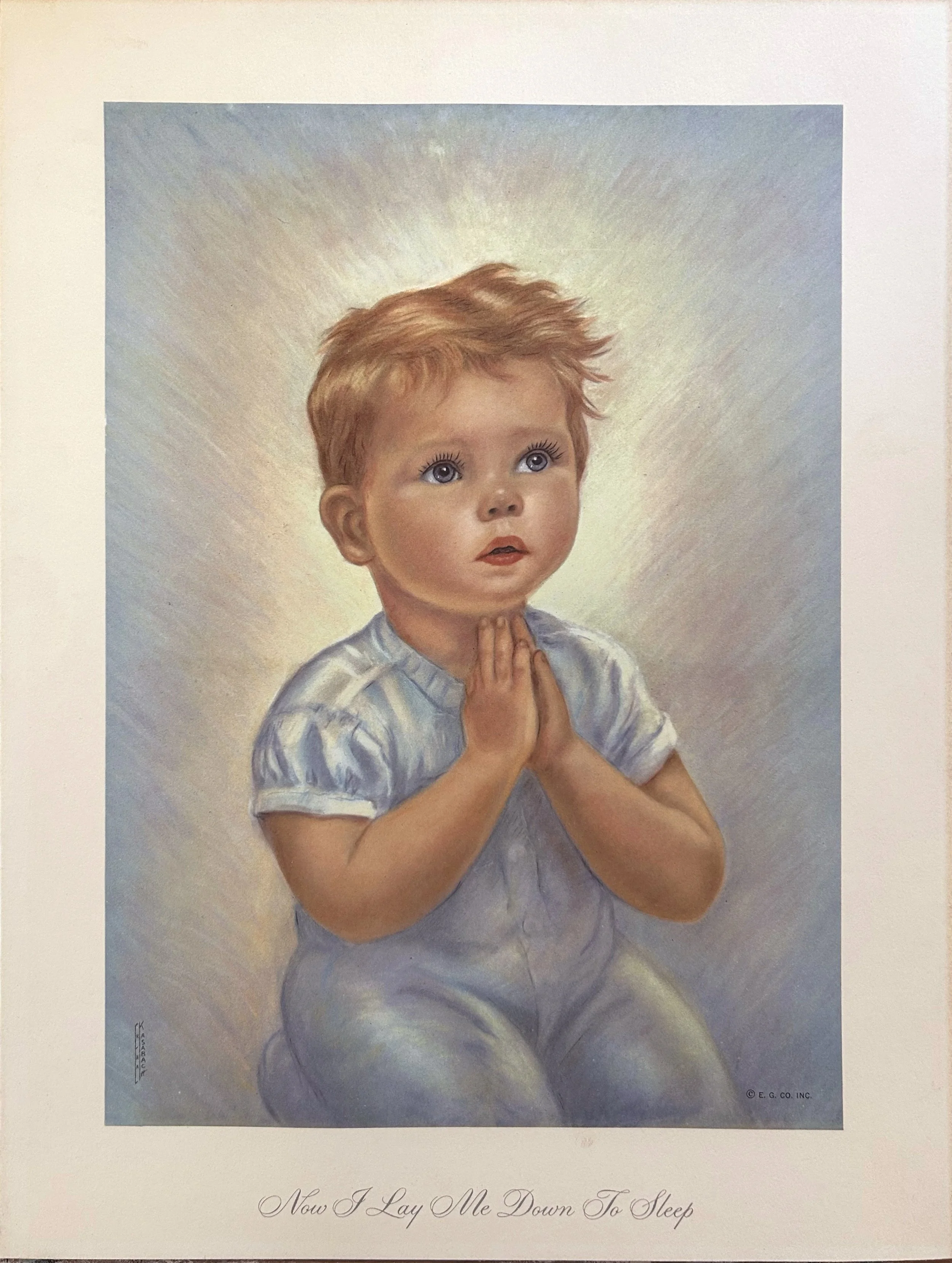This summer I purchased a framed print by the artist Erna Kasabach (1906-1989) from Hidden Treasures Thrift Store in NE Minneapolis. The image depicts a young caucasian child kneeling in prayer in front of an illuminated background, gazing upwardly to his left. The phrase ‘Now I lay me down to sleep,’ is written below in a decorative freehand font…