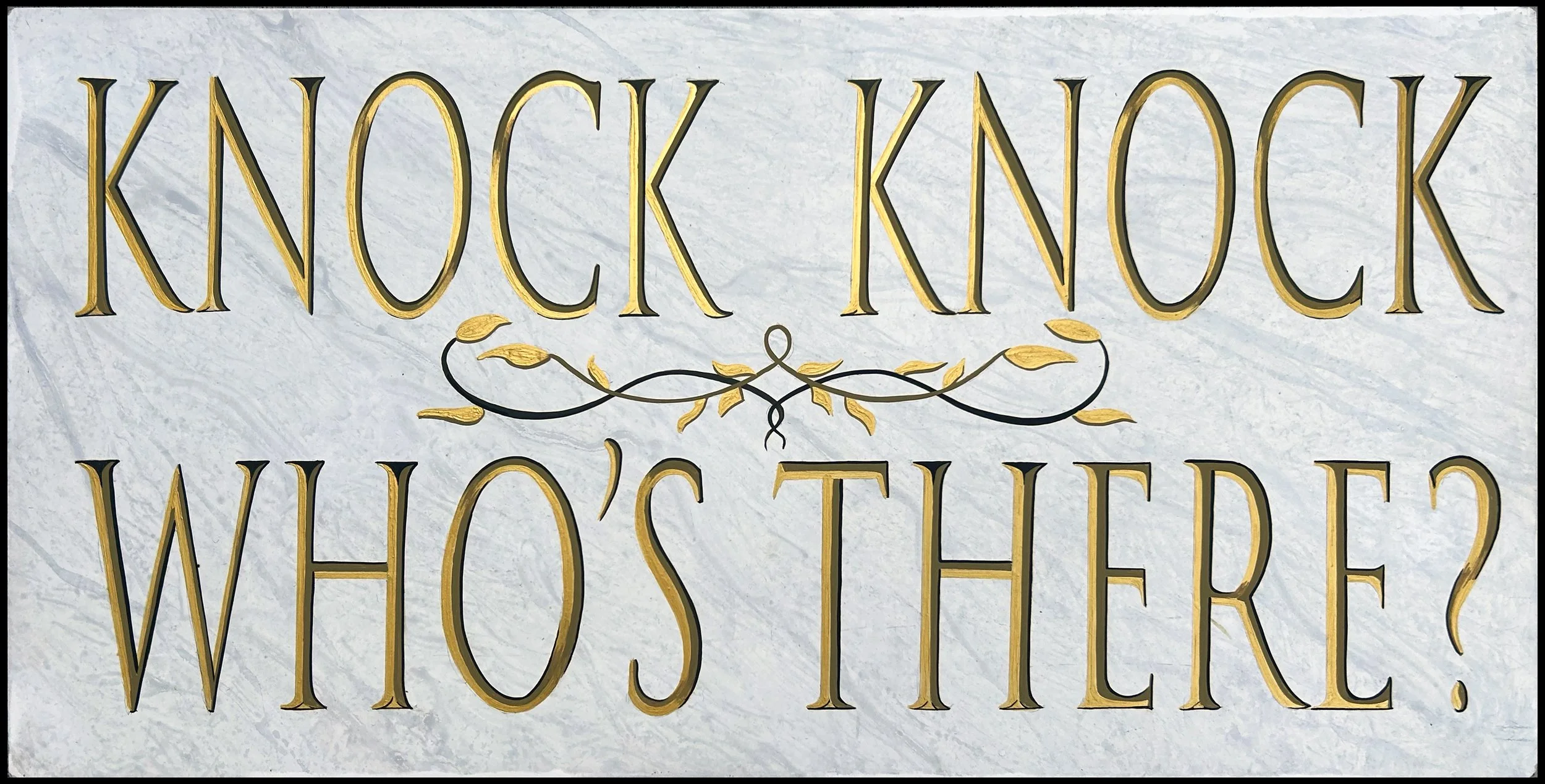 ‘Knock Knock’, acrylic paint on 1/2” MDF painted faux-marble, 12 x 24.5”, 2025