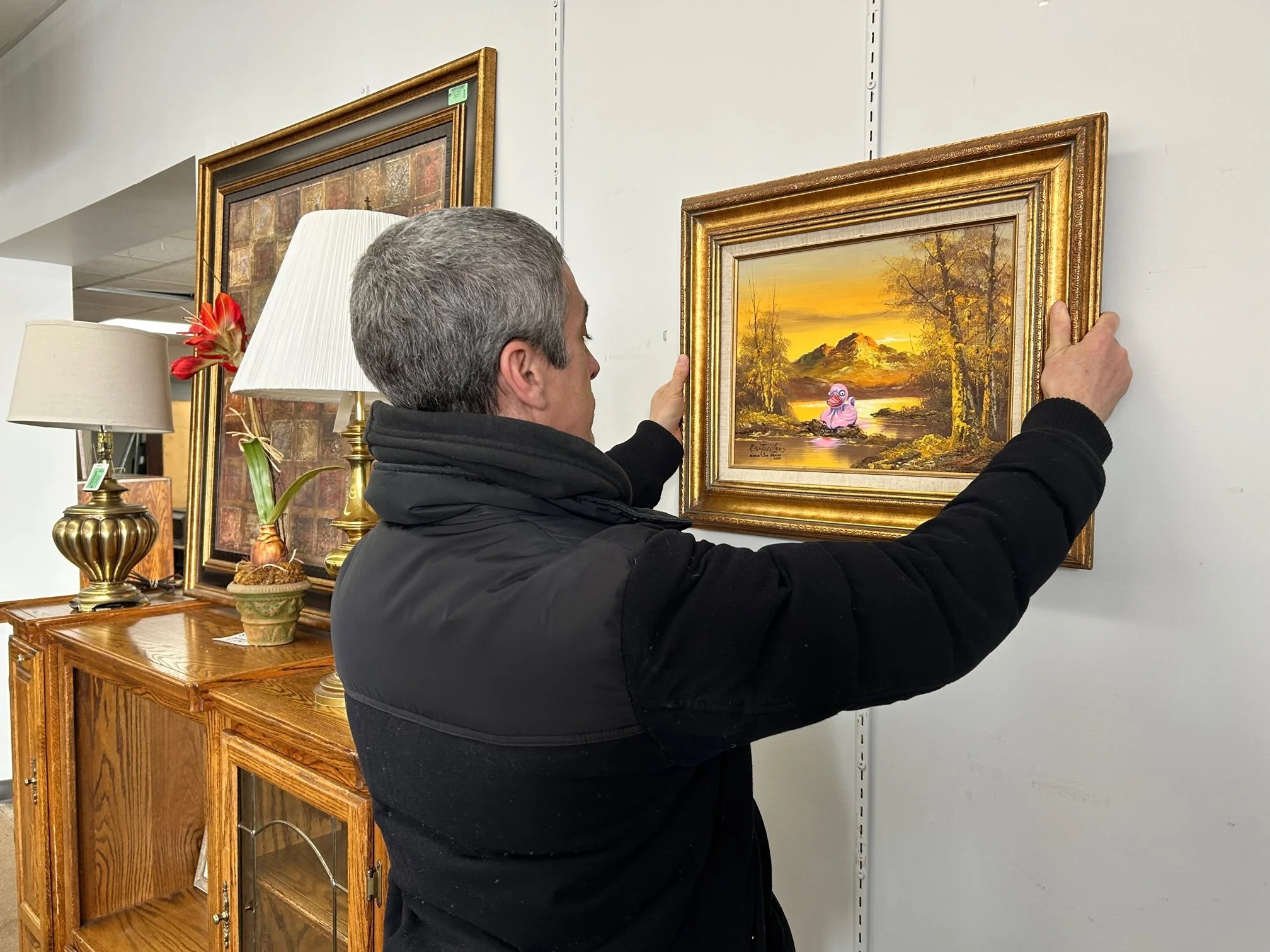 The completed painting being hung at Hidden Treasures Thrift Store.