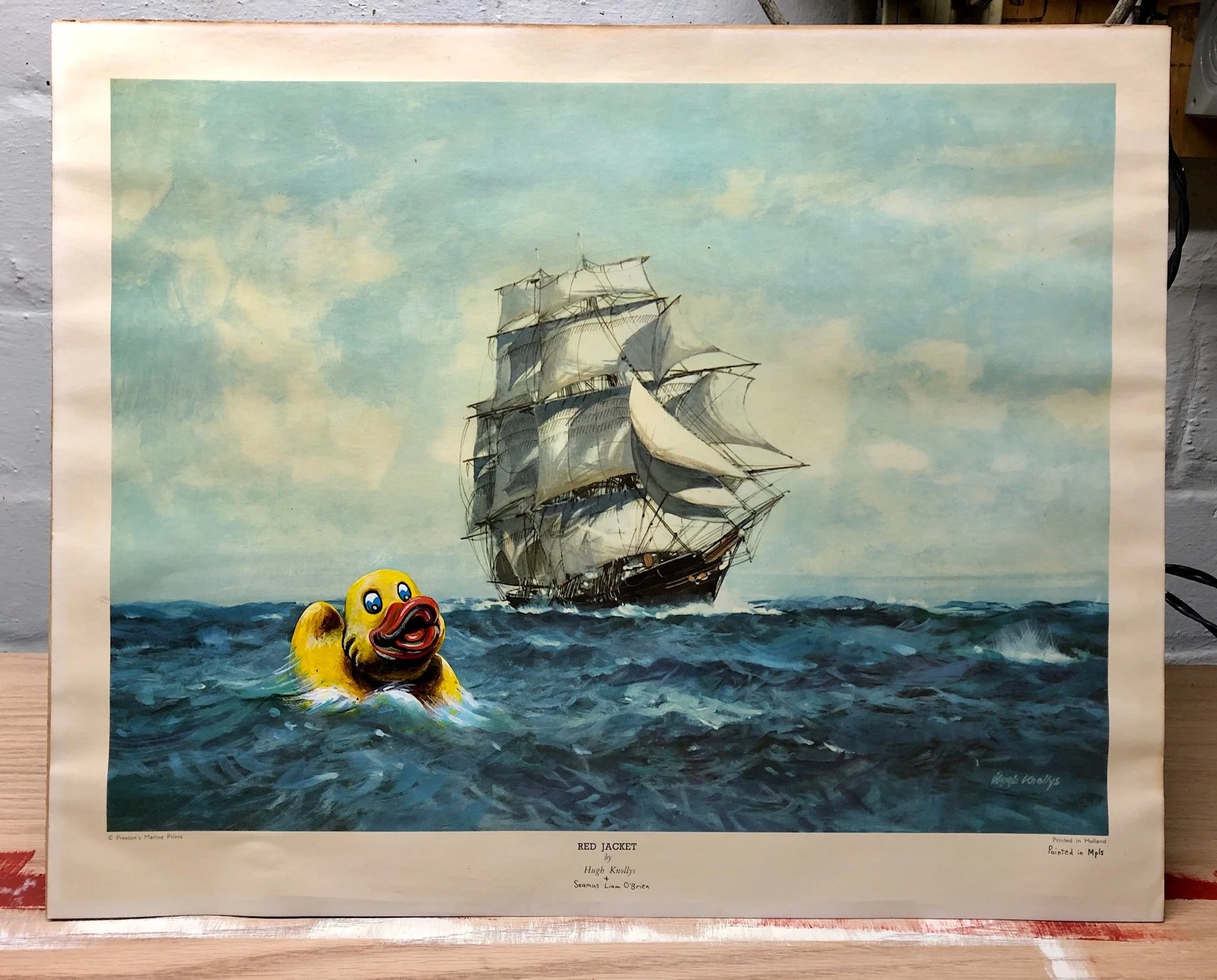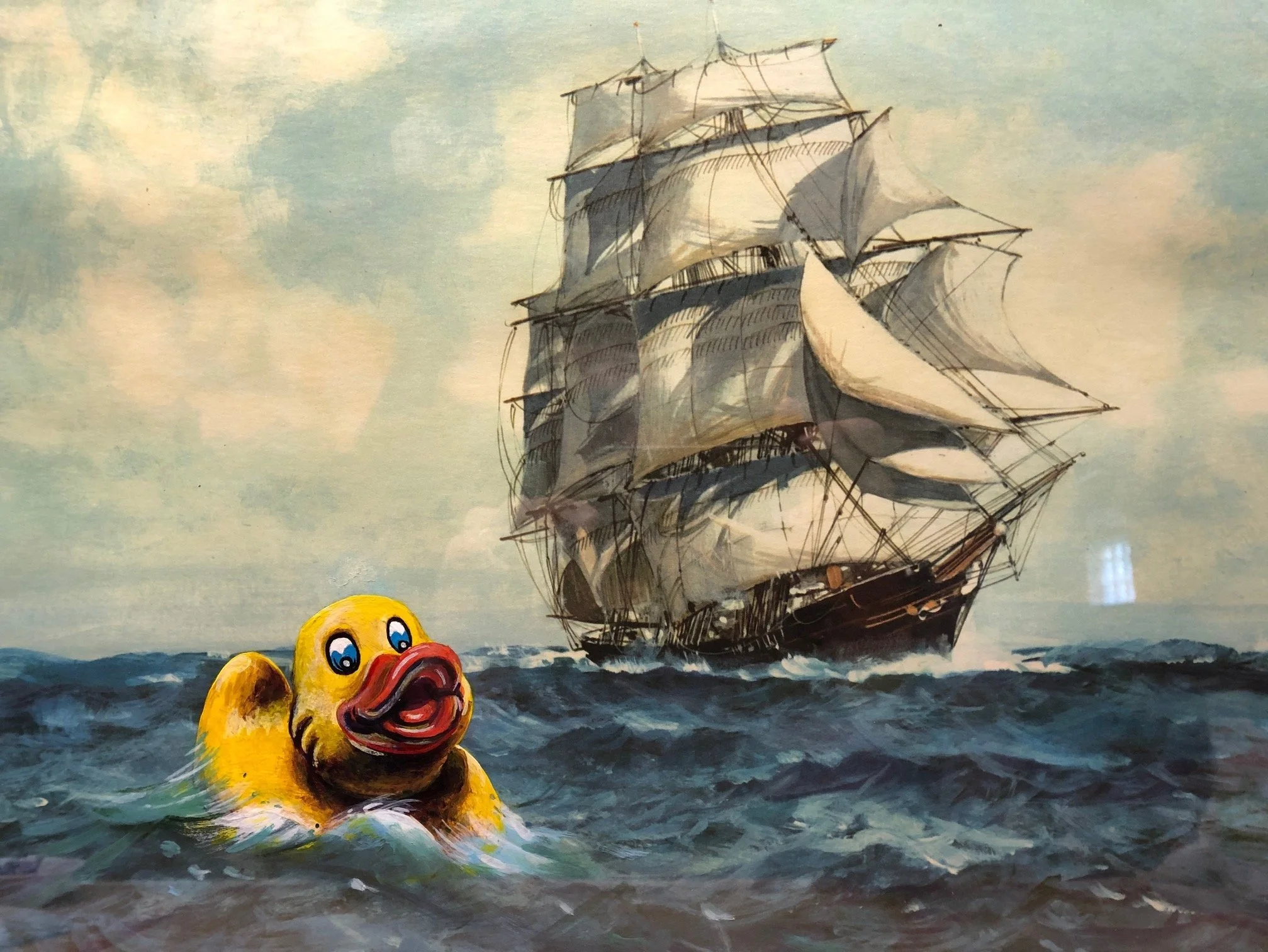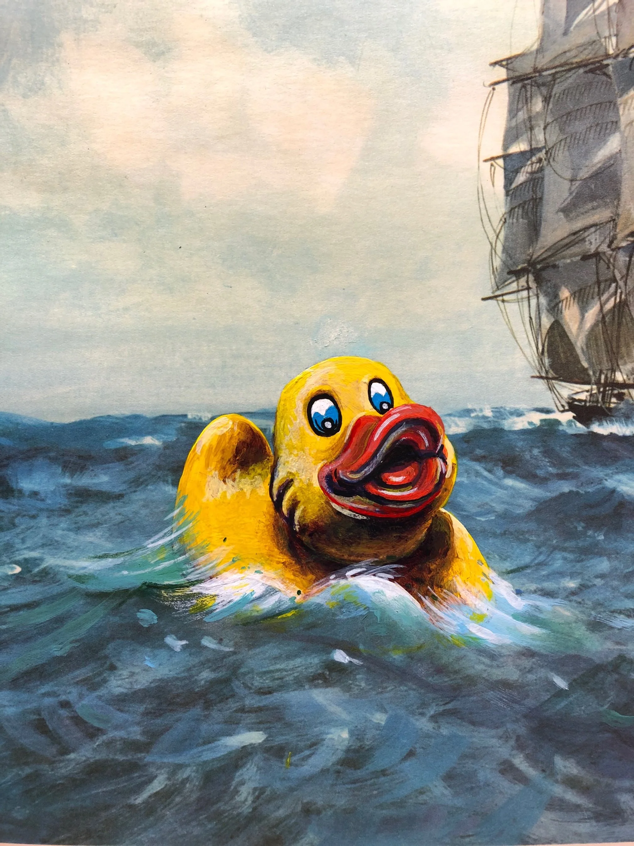 A rubber duck was painted on the print, bobbling along in the ocean next to the ship.