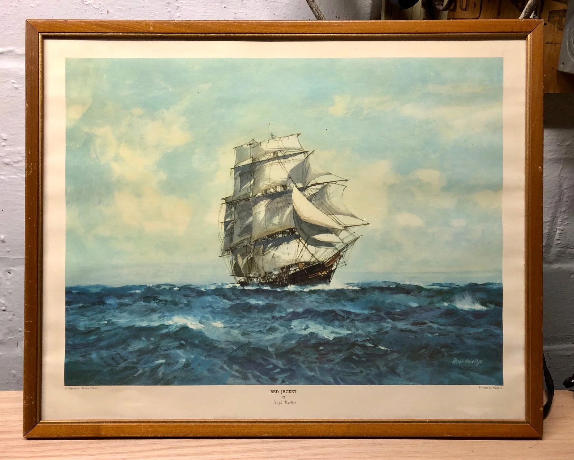I purchased a framed print (print of a painting) by the artist Hugh Knollys from Hidden Treasures Thrift Store (2915 Pentagon Drive, Minneapolis, MN 55418). Titled ‘Red Jacket’, (which I am assuming is the name of the ship) the landscape painting presents a large ship sailing across the sea. Signature on the bottom right.