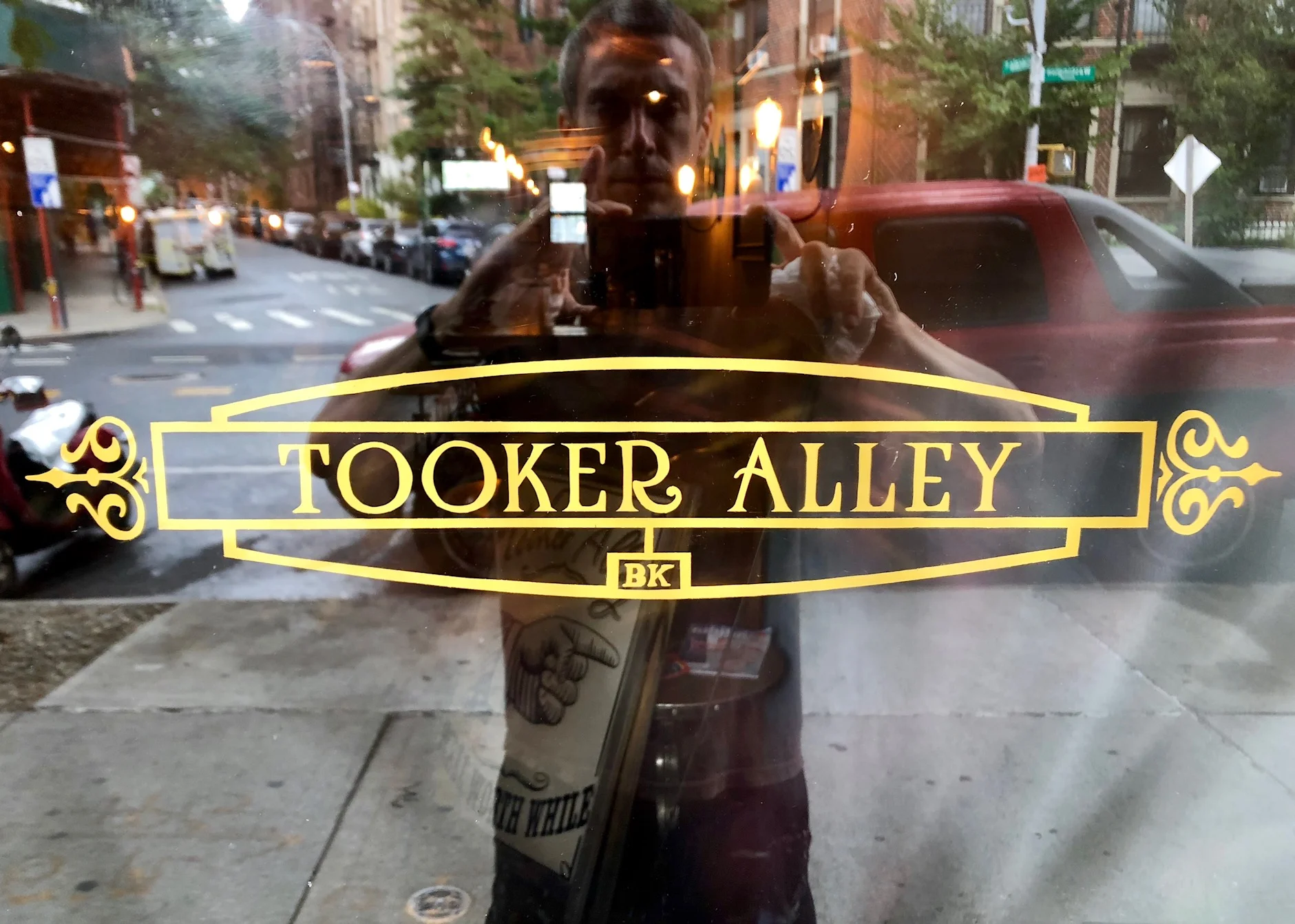 New window sign painting for the local Prospect Heights bar, Tooker Alley.